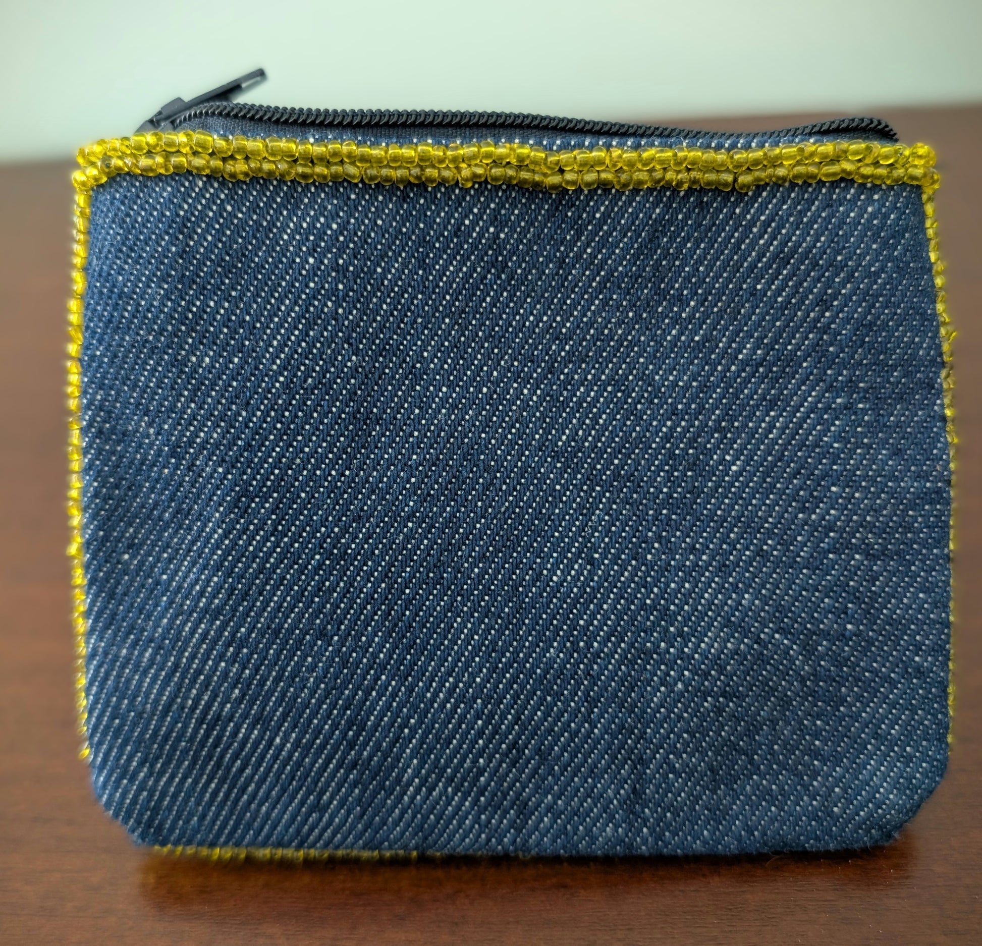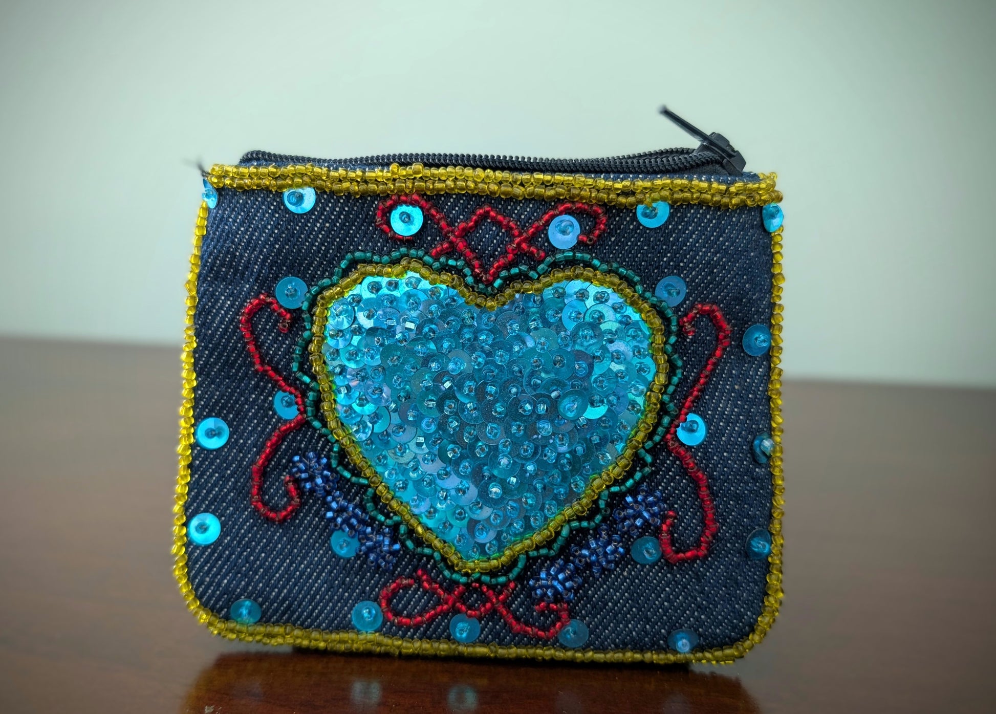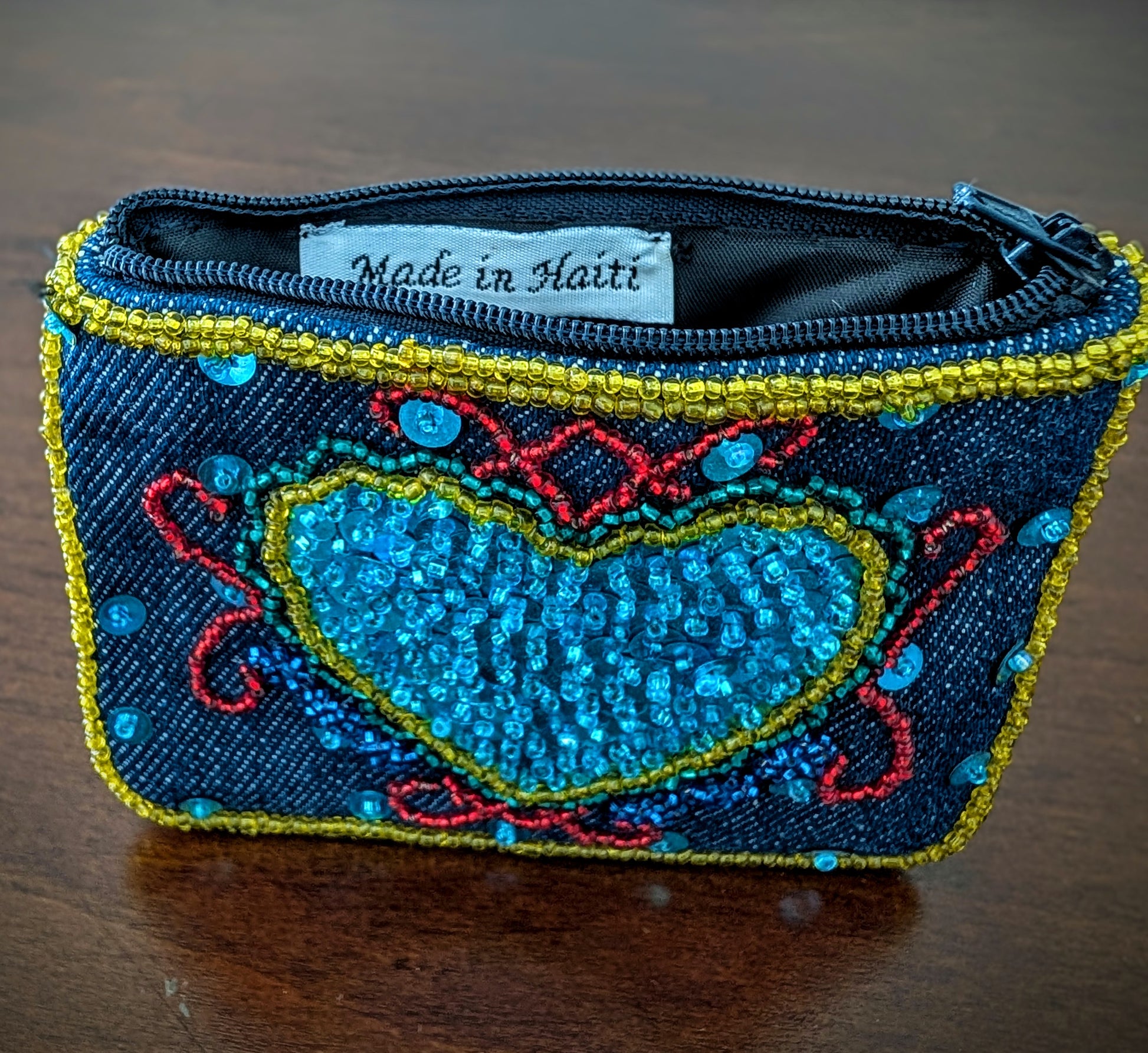 A handmade denim material wallet adorned with a hand-beaded Dantor Veve symbol. Features a secure zipper closure. A meaningful spiritual accessory rooted in Haitian tradition.